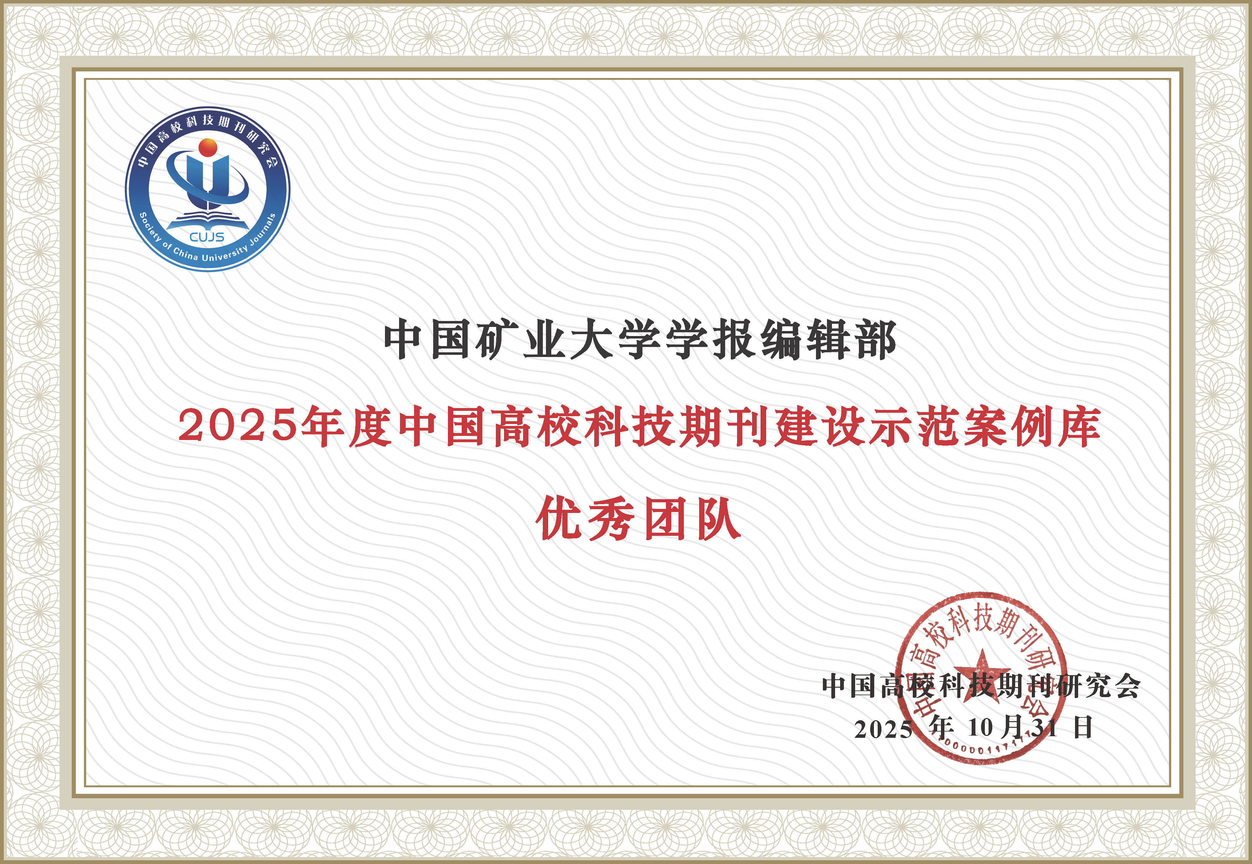 中国矿业大学学报编辑部荣获2025年度中国高校科技期刊建设示范案例库——优秀团队