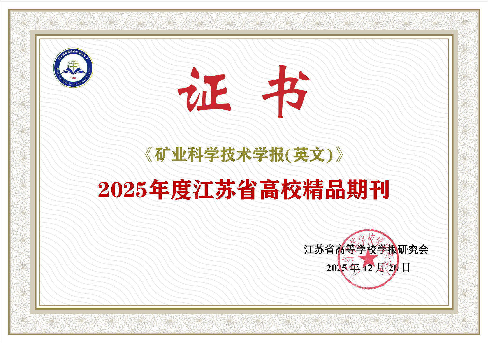 《国际矿业科学技术学报》(英文)荣获“2025年度江苏省高校精品期刊”称号