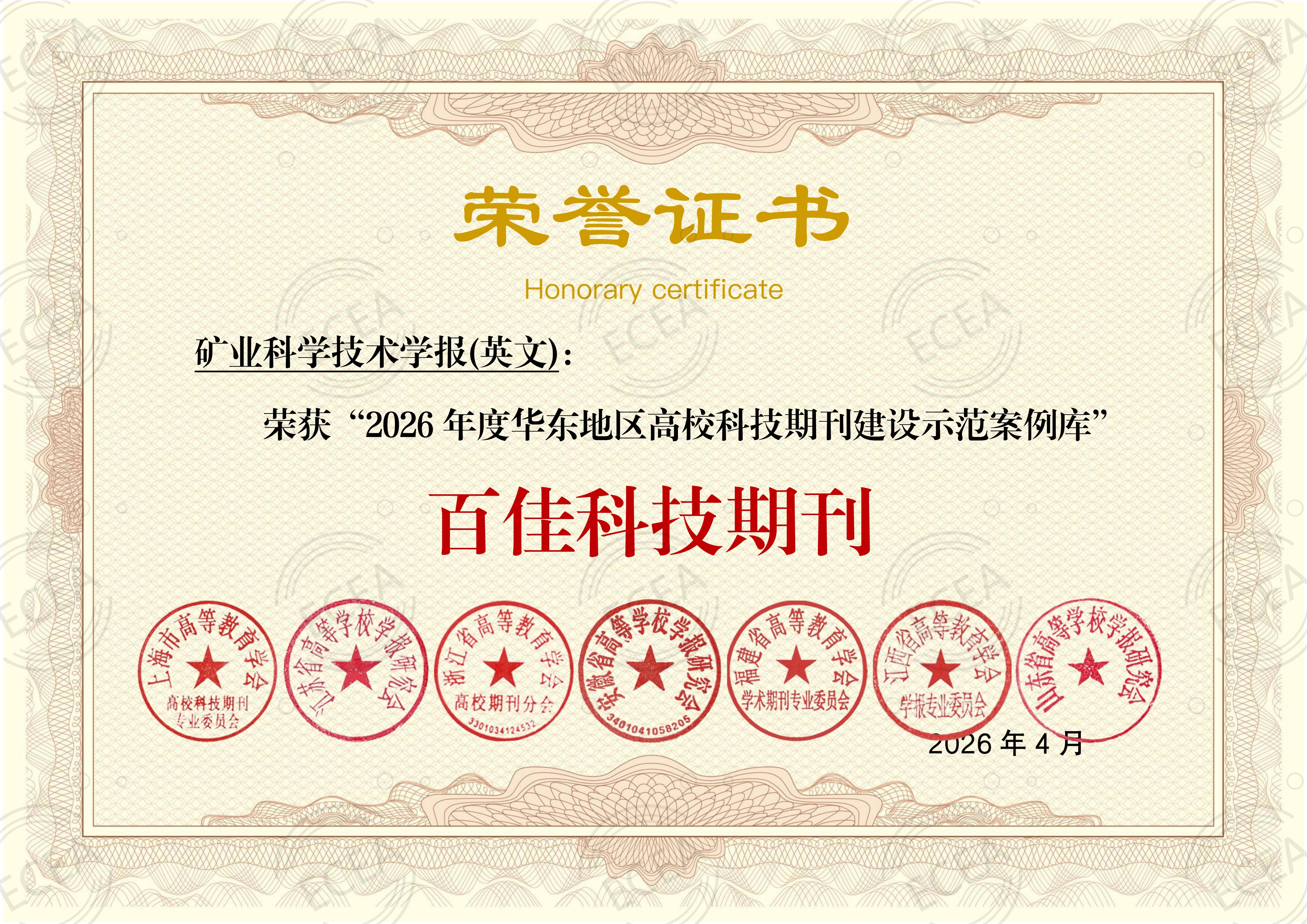 《国际矿业科学技术学报》(英文)荣获2026年度华东地区高校科技期刊建设示范案例库-百佳科技期刊